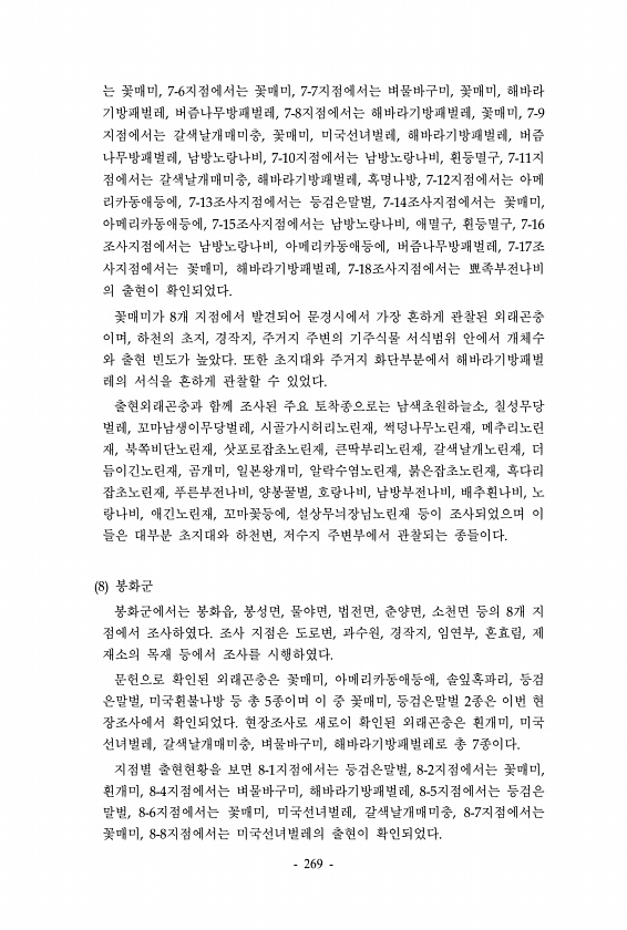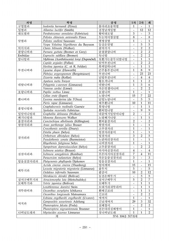 는 꽃매미, 7-6지점에서는 꽃매미, 7-7지점에서는 벼물바구미, 꽃매미, 해바라 기방패벌레, 버즘나무방패벌레, 7-8지점에서는 해바라기방패벌레, 꽃매미, 7-9 지점에서는 갈색날개매미충, 꽃매미, 미국선녀벌레, 해바라기방패벌레, 버즘 나무방패벌레, 남방노랑나비, 7-10지점에서는 남방노랑나비, 흰등멸구, 7-11지 점에서는 갈색날개매미충, 해바라기방패벌레, 혹명나방, 7-12지점에서는 아메 리카동애등에, 7-13조사지점에서는 등검은말벌, 7-14조사지점에서는 꽃매미, 아메리카동애등에, 7-15조사지점에서는 남방노랑나비, 애멸구, 흰등멸구, 7-16 조사지점에서는 남방노랑나비, 아메리카동애등에, 버즘나무방패벌레, 7-17조 사지점에서는 꽃매미, 해바라기방패벌레, 7-18조사지점에서는 뾰족부전나비 의 출현이 ...