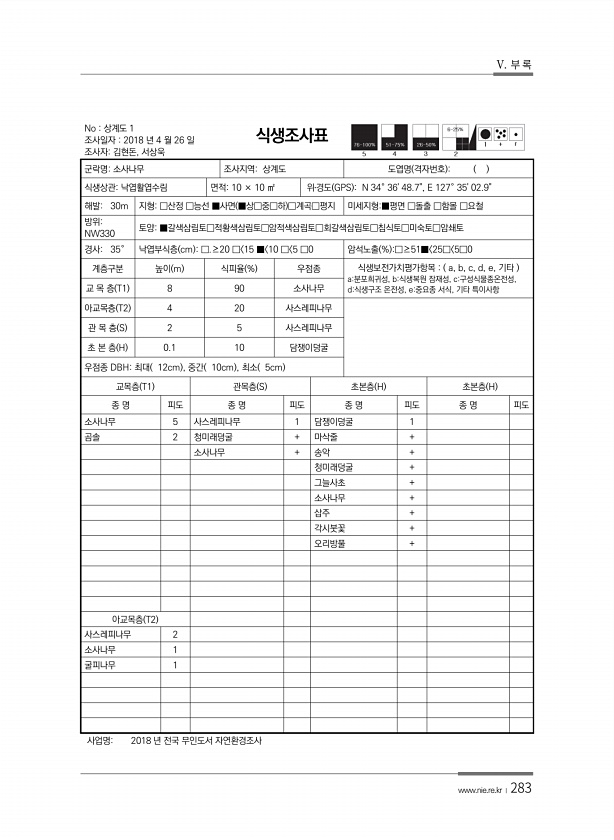V. 부 록 www.nie.re.kr ?283 No 상계도 1 조사일자 2018 년 4 월 26 일 조사자김현돈, 서상욱 식생조사표 군락명소사나무 조사지역상계도 도엽명 격자번호 식생상관낙엽활엽수림 면적10 × 10 ㎡ 위?경도 GPS N 34° 3648.7, E 127° 3502.9해발30m 지형□산정 □능선 ■사면 ■상□중□하 □계곡□평지 미세지형■평면 □돌출 □함몰 □요철 방위NW330 토양■갈색삼림토□적황색삼림토□암적색삼림토□회갈색삼림토□침식토□미숙토□암쇄토 경사35° 낙엽부식층 cm □.≥20 □ 15 ■ 10 □ 5 □0 암석노출 % □≥51■ 25□ 5□0 계층구분 높이 m 식피율 % 우점종 식생보전가치평가항목 a, b, c, d, e, 기타 a분포희귀성, b식생복원 잠재성, c구성식물종온전성, ...