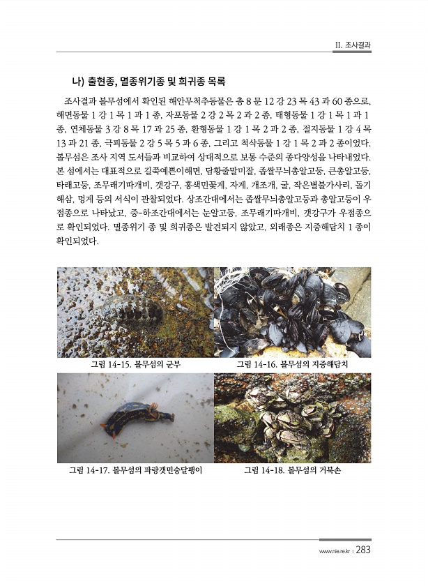 II. 조사결과 www.nie.re.kr ?283 , 조사결과 볼무섬에서 확인된 해안무척추동물은 총 8 문 12 강 23 목 43 과 60 종으로, 해면동물 1 강 1 목 1 과 1 종, 자포동물 2 강 2 목 2 과 2 종, 태형동물 1 강 1 목 1 과 1 종, 연체동물 3 강 8 목 17 과 25 종, 환형동물 1 강 1 목 2 과 2 종, 절지동물 1 강 4 목 13 과 21 종, 극피동물 2 강 5 목 5 과 6 종, 그리고 척삭동물 1 강 1 목 2 과 2 종이었다. 볼무섬은 조사 지역 도서들과 비교하여 상대적으로 보통 수준의 종다양성을 나타내었다. 본 섬에서는 대표적으로 길쭉예쁜이해면, 담황줄말미잘, 좁쌀무늬총알고둥, 큰총알고둥, 타래고둥, 조무래기따개비, 갯강구, 홍색민꽃게, 자게, 개조개, ...