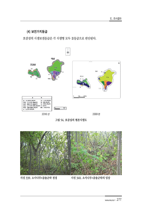 II. 조사결과 www.nie.re.kr ?277 4 호감섬의 식생보전등급은 각 식생형 모두 Ⅱ등급으로 판단된다. 2018 년 2009 년 그림 54. 호감섬의 현존식생도 사진 339. 소사나무-곰솔군락 전경 사진 340. 소사나무-곰솔군락의임상