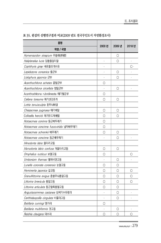 II. 조사결과 www.nie.re.kr ?279 종명 2000 년 2009 년 2018 년 학명 국명 Hymeniacidon sinapium 주황해변해면 ○ Haliplanelaa lucia 담황줄말미잘 ○ Coptithyris grayi 세로줄조개사돈 ○ Lepidozona coreanica 줄군부 ○ Liolophura japonica 군부 ○ Acanthochitona achates 좀털군부 ○ Acanthochitona circellata 참털군부 ○ Acanthochitona rubrolineata 애기털군부 ○ Cellana toreuma 애기삿갓조개 ○ ○ Lottia tenuisculpta 흰무늬배말 Chiazacmea pygmaea 애기배말 ○ ○ Coll...