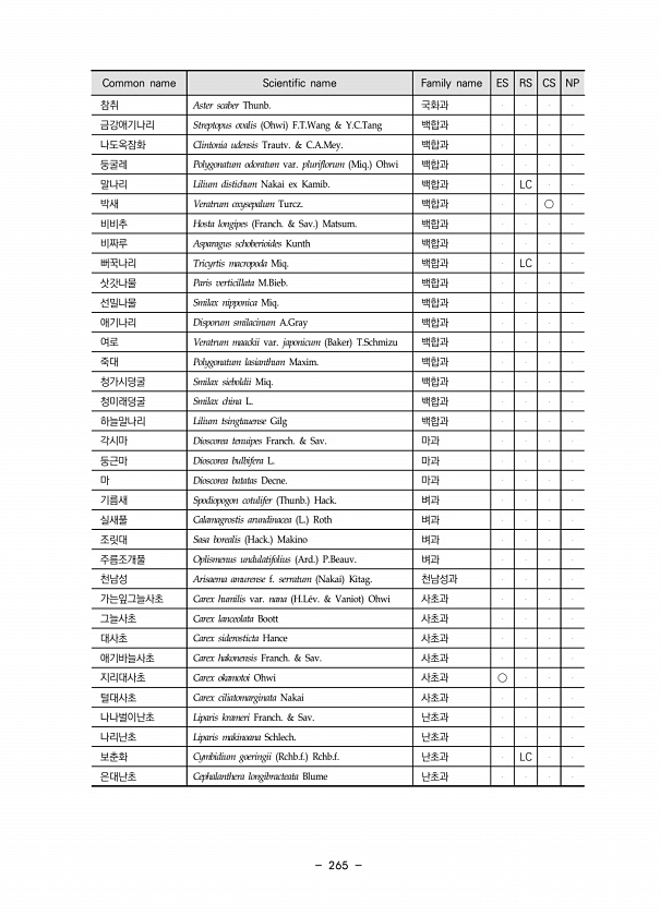 265 Common name Scientific name Family name ES RS CS NP 참취 Aster scaber Thunb. 국화과 금강애기나리 Streptopus ovalis Ohwi F.T.Wang & Y.C.Tang 백합과 나도옥잠화 Clintonia udensis Trautv. & C.A.Mey. 백합과 둥굴레 Polygonatum odoratum var. pluriflorum Miq. Ohwi 백합과 말나리 Lilium distichum Nakai ex Kamib. 백합과 LC 박새 Veratrum oxysepalum Turcz. 백합과 ○ 비비추 Hosta longipes Franch. & Sav. Matsum. 백합과 비짜루 Asparagus schoberioides Kunth ...