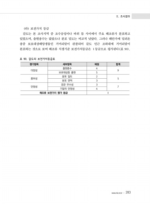 Ⅱ. 조사결과 www.nie.re.kr ? 283 라 보전가치 등급 갈도는 본 조사지역 중 조수웅덩이나 바위 틈 사이에서 주요 해조류가 분포하고 있었으며, 출현종수는 많았으나 분포 밀도는 비교적 낮았다. 그러나 해안가에 밀려온 종중 보호대상해양생물인 거머리말이 관찰되어 갈도 인근 조하대에 거머리말이 분포하는 것으로 보여 해조류 식생기준 보전가치등급은 Ⅰ등급으로 평가된다 표 90 표 90. 갈도의 보전가치등급표 평가항목 세부항목 배점 합계 다양성 출현종수 4 9 보호대상종 출현 5 풍부성 분포 밀도 2 5 분포 면적 3 안정성 경관 우수성 3 7 기질의 안정성 4 해조류 보전가치 평가 등급I