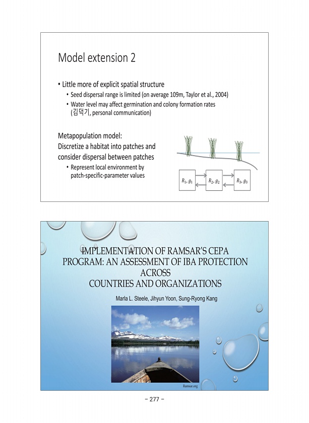 IMPLEMENTATION OF RAMSAR’S CEPA PROGRAMAN ASSESSMENT OF IBA PROTECTION ACROSS COUNTRIES AND ORGANIZATIONS Ramsar.org Marla L. Steele, Jihyun Yoon, Sung-Ryong Kang Model extension 2 ? Little more of explicit spatial structure ? Seed dispersal range is limited on average 109m, Taylor et al., 2004 ? Water level may affect germination and colony formation rates 김덕기, personal communication Metapopulati...
