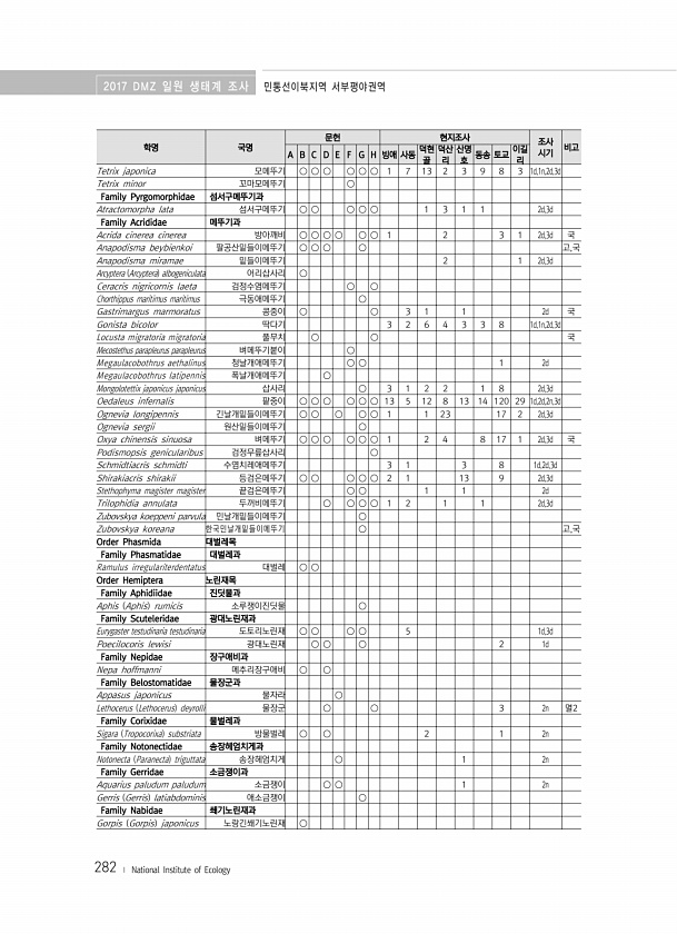 2017 DMZ 일원 생태계 조사 민통선이북지역 서부평야권역 282 ? National Institute of Ecology 학명 국명 문헌 현지조사 조사 A B C D E F G H 빙애 사동 덕현 시기 비고 골 덕산 리 산명 호 동송 토교 이길 리 Tetrix japonica 모메뚜기 ○ ○ ○ ○ ○ ○ 1 7 13 2 3 9 8 3 1d,1n,2d,3d Tetrix minor 꼬마모메뚜기 ○ Family Pyrgomorphidae 섬서구메뚜기과 Atractomorpha lata 섬서구메뚜기 ○ ○ ○ ○ ○ 1 3 1 1 2d,3d Family Acrididae 메뚜기과 Acrida cinerea cinerea 방아깨비 ○ ○ ○ ○ ○ ○ 1 2 3 1 2d,3d 국 Anapodisma beybie...