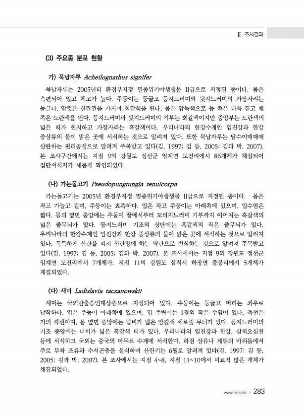 Ⅱ. 조사결과 www.nie.re.kr ? 283 3 주요종 분포 현황 가 묵납자루 Acheilognathus signifer 묵납자루는 2005년터 환경부지정 멸종위기야생생물 II급으로 지정된 종이다. 몸은 측편되어 있고 체고가 높다. 주둥이는 둥글고 등지느러미와 뒷지느러미의 가장자리는 둥글다. 암컷은 산란관을 가지며 회갈색을 띤다. 몸은 암녹색으로 등 쪽은 더욱 짙고 배 쪽은 노란색을 띤다. 등지느러미와 뒷지느러미의 기부는 회갈색이지만 중앙부는 노란색의 넓은 띠가 현저하고 가장자리는 흑갈색이다. 우리나라의 한강수계인 임진강과 한강 중상류의 물이 맑은 곳에 서식하는 것으로 알려져 있다. 또한 묵납자루는 담수이매패에 산란하는 편리공생으로 알려져 주목받고 있다 김, 1997; 김 등, 2005; 김과 박, 2...