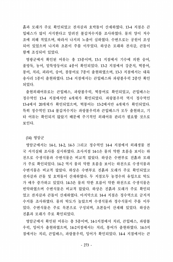 273 흙과 모래가 주로 확인되었고 잔자갈과 호박돌이 산재하였다. 13-4 지점은 큰 입배스가 많이 서식한다고 알려진 불갑저수지를 조사하였다. 물의 양이 저수 조에 의해 적었으며, 따라서 나지의 노출이 심하였다. 수변으로는 공원이 조성 되어 있었으며 나지와 초본이 주를 이루었다. 하상은 모래와 잔자갈, 큰돌이 함께 조성되어 있었다. 영광군에서 확인된 어류는 총 13종이며, 13-1 지점에서 기수에 의한 숭어, 풀망둑, 농어, 말뚝망둥어로 4종이 확인되었다. 13-2 지점에서 강준치, 떡붕어, 붕어, 치리, 피라미, 숭어, 참붕어로 7종이 출현하였으며, 13-3 지점에서는 대륙 송사리 1종이 출현하였다. 13-4 지점에서는 큰입배스와 파랑볼우럭 2종만 확인 되었다. 출현외래어류로는 큰입배스, 파랑볼우럭, 떡붕...