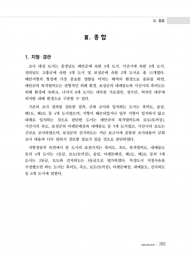 Ⅲ. 종합 www.nie.re.kr ? 283 Ⅲ. 종 합 1. 지형 ? 경관 조사 대상 도서는 충청남도 태안군에 속한 3개 도서, 서산시에 속한 3개 도서, 전라남도 고흥군에 속한 3개 도서 및 보성군에 속한 2개 도서로 총 11개였다. 해안지형의 형성에 가장 중요한 영향을 미치는 해역의 환경으로 분류를 하면, 태안군의 북격렬비도는 전형적인 외해 환경, 보성군의 내매물도와 서산시의 흑어도는 외해 환경에 속하고, 나머지 8개 도서는 대부분 가로림만, 천수만, 여자만 내부에 위치한 내해 환경으로 구분할 수 있다. 기존의 조사 결과를 검토한 결과, 금회 조사와 일치하는 도서는 흑어도, 솔섬, 해1도, 해2도 등 4개 도서였으며, 지형이 훼손되었거나 일부 지형이 일치하지 않고 대체로 일치하는 것으로 판단한 도서는...