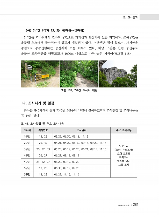 Ⅱ. 조사결과 www.nie.re.kr ? 281 사 7구간 격자 15, 23귀바위∼쌀바위 7구간은 귀바위에서 쌀바위 구간으로 가지산과 연접되어 있는 지역이다. 조사구간은 운문령 초소에서 쌀바위까지 임도가 개설되어 있다. 이용객은 많이 않으며, 가지산을 종점으로 종주산행하는 등산객이 주를 이루고 있다. 해당 구간은 산림 능선부로 운문산 조사구간중 해발고도가 1000m 이상으로 가장 높은 지역이다 그림 118 그림 118. 7구간 조사지 개황 나. 조사시기 및 일정 조사는 총 5차례에 걸쳐 2015년 5월부터 11월에 실시하였으며 조사일정 및 조사내용은 표 49와 같다. 표 49. 조사일정 및 주요 조사내용 조사지 격자번호 조사일자 주요 조사내용 1구간 18, 25 05.22, 06.30, 09.18, 11....