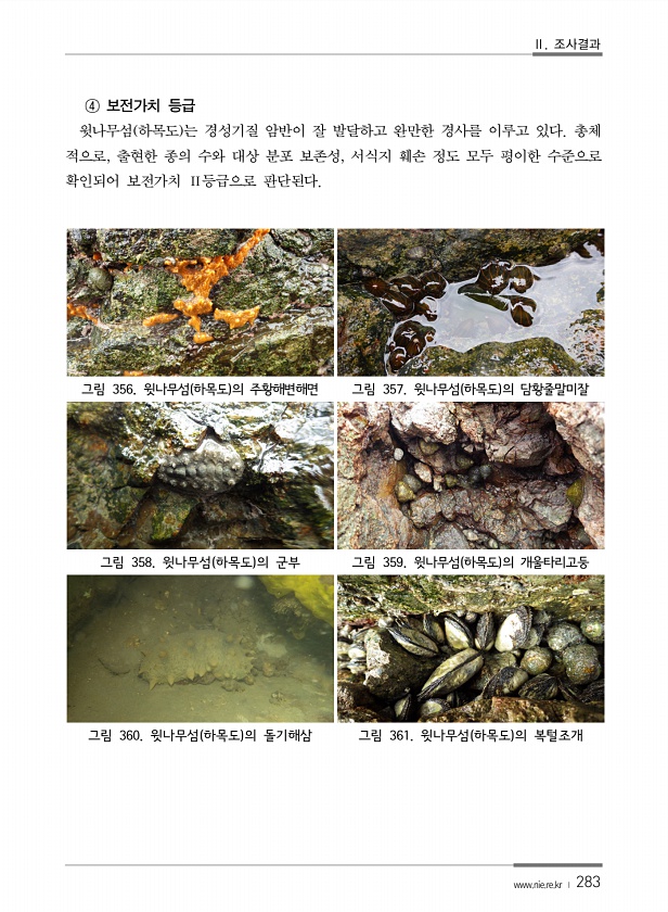 Ⅱ. 조사결과 www.nie.re.kr ? 283 그림 356. 윗나무섬 하목도 의 주황해변해면 그림 357. 윗나무섬 하목도 의 담황줄말미잘 그림 358. 윗나무섬 하목도 의 군부 그림 359. 윗나무섬 하목도 의 개울타리고둥 그림 360. 윗나무섬 하목도 의 돌기해삼 그림 361. 윗나무섬 하목도 의 복털조개 ④ 보전가치 등급 윗나무섬 하목도 는 경성기질 암반이 잘 발달하고 완만한 경사를 이루고 있다. 총체 적으로, 출현한 종의 수와 대상 분포 보존성, 서식지 훼손 정도 모두 평이한 수준으로 확인되어 보전가치 Ⅱ등급으로판단된다.