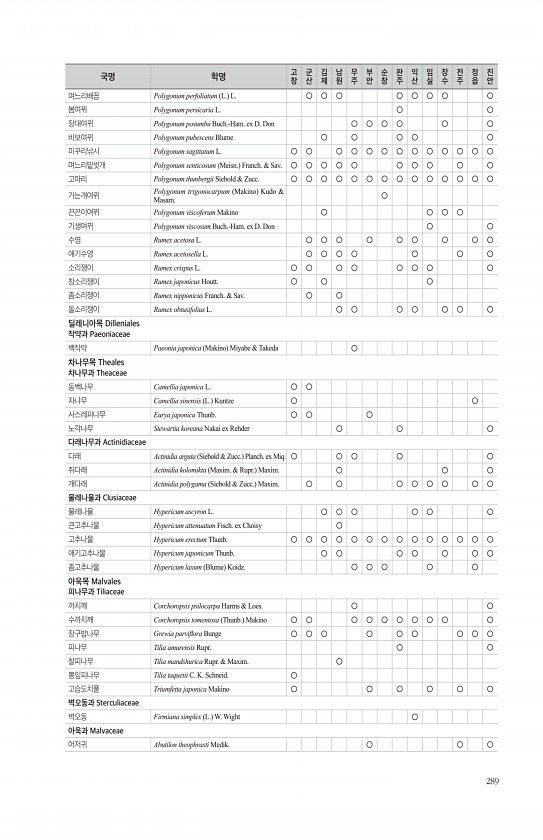 289 며느리배꼽 Polygonum perfoliatum L. L. ○ ○ ○ ○ ○ ○ ○ ○ 봄여뀌 Polygonum persicaria L. ○ ○ 장대여뀌 Polygonum posumbu Buch.-Ham. ex D. Don ○ ○ ○ ○ ○ ○ 바보여뀌 Polygonum pubescens Blume ○ ○ ○ ○ ○ 미꾸리낚시 Polygonum sagittatum L. ○ ○ ○ ○ ○ ○ ○ ○ ○ ○ ○ ○ ○ 며느리밑씻개 Polygonum senticosum Meisn. Franch. & Sav. ○ ○ ○ ○ ○ ○ ○ ○ ○ ○ 고마리 Polygonum thunbergii Siebold & Zucc. ○ ○ ○ ○ ○ ○ ○ ○ ○ ○ ○ ○ ○ ○ 가는개여뀌 Polygonum trigon...