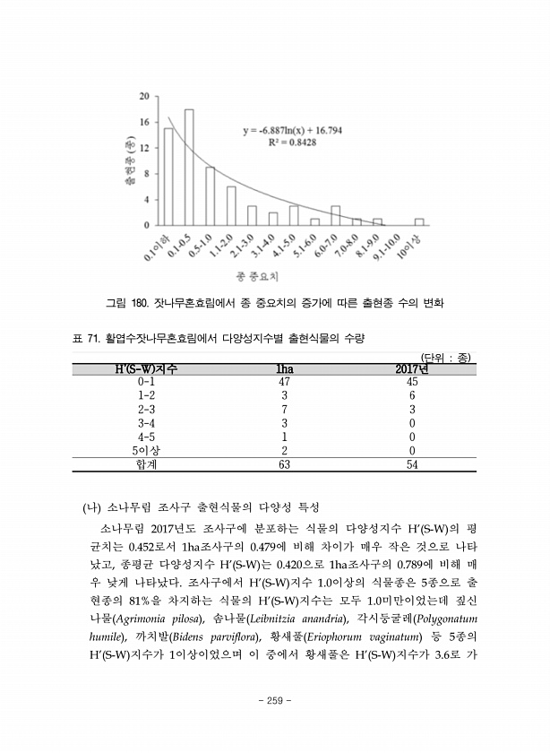 그림 180. 잣나무혼효림에서 종 중요치의 증가에 따른 출현종 수의 변화 단위 종 HS-W 지수 1ha 2017년 0-1 47 45 1-2 3 6 2-3 7 3 3-4 3 0 4-5 1 0 5이상 2 0 합계 63 54 표 71. 활엽수잣나무혼효림에서 다양성지수별 출현식물의 수량 나 소나무림 조사구 출현식물의 다양성 특성 소나무림 2017년도 조사구에 분포하는 식물의 다양성지수 H’ S-W 의 평 균치는 0.452로서 1ha조사구의 0.479에 비해 차이가 매우 작은 것으로 나타 났고, 종평균 다양성지수 H’ S-W 는 0.420으로 1ha조사구의 0.789에 비해 매 우 낮게 나타났다. 조사구에서 H’ S-W 지수 1.0이상의 식물종은 5종으로 출 현종의 81%을 차지하는 식물의 H’ S-W 지수는 모두 ...