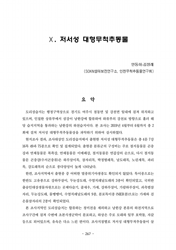 267 .Ⅹ 저서성 대형무척추동물 · 도리섬습지는 행정구역상으로 경기도 여주시 점동면 및 강천면 일대에 걸쳐 위치하고 있으며 인접한 상류부에서 섬강이 남한강에 합류하여 하류부의 강천보 방향으로 흘러 해 , 당 습지지역을 통과하는 남한강의 하천습지이다 본 조사는 년 월부터 월까지 총 2019 4 6 2 회에 걸쳐 저서성 대형무척추동물상을 파악하기 위하여 실시하였다. 현지조사 결과 조사대상인 도리섬습지에서 출현한 저서성 대형무척추동물은 총 문 강 , 4 7 16 49 75 목 과 종으로 확인 및 집계되었다 출현종 분류군의 구성비는 주로 절지동물문 곤충 강과 연체동물문 복족강 연체동물문 이매패강 절지동물문 연갑강의 순으로 다시 절지동 , , , 물문 곤충강 수서곤충류 은 하루살이목 잠자리목 딱정벌레목 날도래목 노...