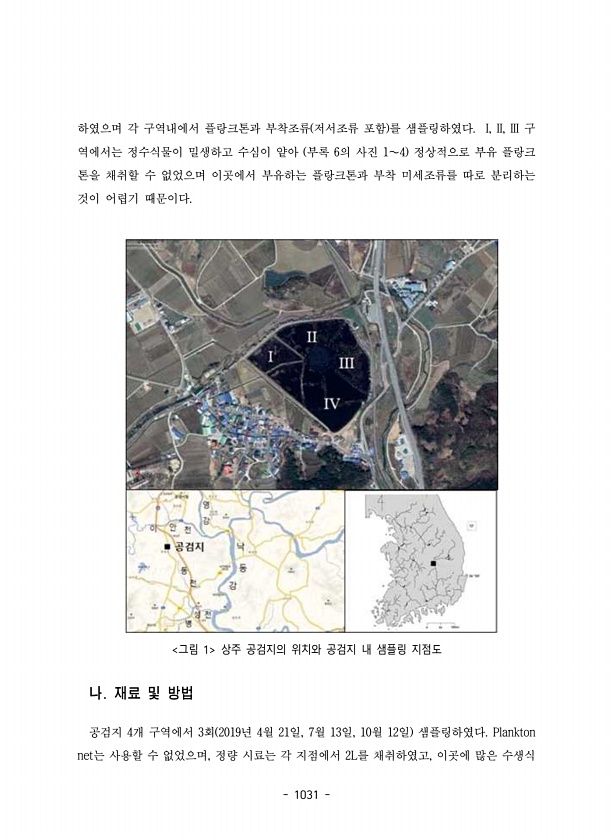 1031 하였으며 각 구역내에서 플랑크톤과 부착조류 저서조류 포함 를 샘플링하였다. I, II, III 구 역에서는 정수식물이 밀생하고 수심이 얕아 부록 6의 사진 1∼4 정상적으로 부유 플랑크 톤을 채취할 수 없었으며 이곳에서 부유하는 플랑크톤과 부착 미세조류를 따로 분리하는 것이 어렵기 때문이다. 그림 1 상주 공검지의 위치와 공검지 내 샘플링 지점도 나. 재료 및 방법 공검지 4개 구역에서 3회 2019년 4월 21일, 7월 13일, 10월 12일 샘플링하였다. Plankton net는 사용할 수 없었으며, 정량 시료는 각 지점에서 2L를 채취하였고, 이곳에 많은수생식