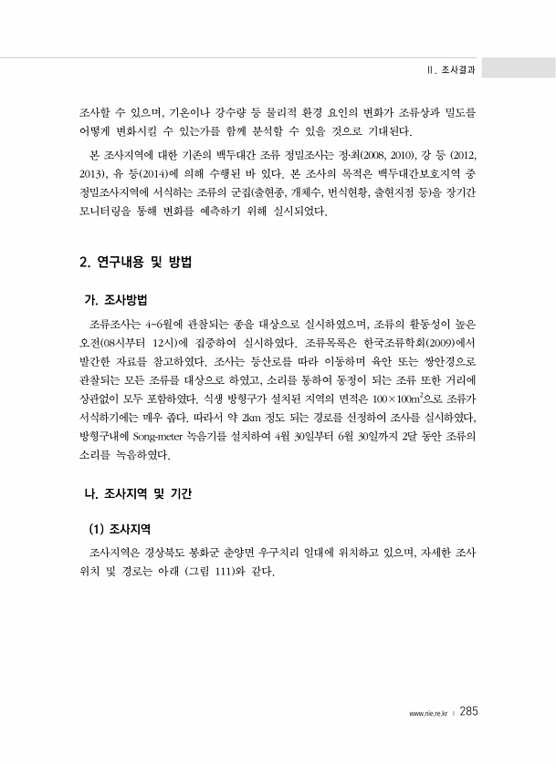 Ⅱ. 조사결과 www.nie.re.kr ? 285 조사할 수 있으며, 기온이나 강수량 등 물리적 환경 요인의 변화가 조류상과 밀도를 어떻게 변화시킬 수 있는가를 함께 분석할 수 있을 것으로 기대된다. 본 조사지역에 대한 기존의 백두대간 조류 정밀조사는 정?최 2008, 2010 , 강 등 2012, 2013 , 유 등 2014 에 의해 수행된 바 있다. 본 조사의 목적은 백두대간보호지역 중 정밀조사지역에 서식하는 조류의 군집 출현종, 개체수, 번식현황, 출현지점 등 을 장기간 모니터링을 통해 변화를 예측하기 위해 실시되었다. 2. 연구내용 및 방법 가. 조사방법 조류조사는 46월에 관찰되는 종을 대상으로 실시하였으며, 조류의 활동성이 높은 오전 08시부터 12시 에 집중하여 실시하였다. 조류목록은 한국조류학...