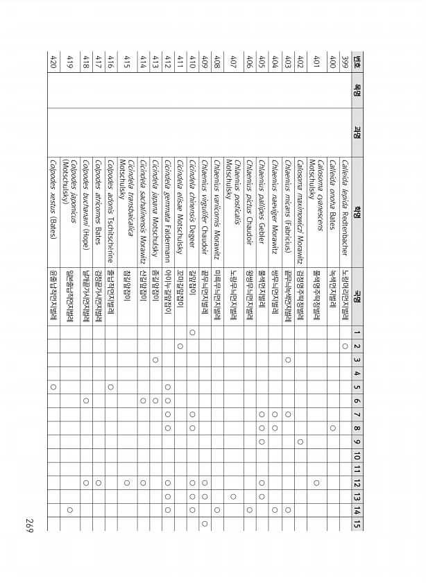 269 번호 목명 과명 학명 국명 1 2 3 4 5 6 7 8 9 10 11 12 13 14 15 399 Calleida lepida Redtenbacher 노랑머리먼지벌레 ○ 400 Calleida onoha Bates 녹색먼지벌레 ○ 401 Calosoma cyanescens Motschulsky 풀색명주딱정벌레 ○ 402 Calosoma maximowiczi Morawitz 검정명주딱정벌레 ○ 403 Chlaenius micans Fabricius 끝무늬녹색먼지벌레 ○ ○ ○ 404 Chlaenius naeviger Morawitz 쌍무늬먼지벌레 ○ ○ ○ 405 Chlaenius pallipes Gebler 풀색먼지벌레 ○ ○ ○ ○ ○ 406 Chlaenius pictus Chaudoir 왕쌍무늬먼...