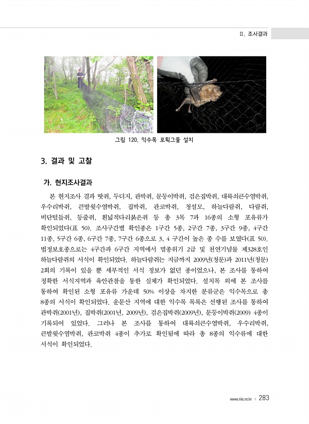 Ⅱ. 조사결과 www.nie.re.kr ? 283 그림 120. 익수목 포획그물 설치 3. 결과 및 고찰 가. 현지조사결과 본 현지조사 결과 땃쥐, 두더지, 관박쥐, 문둥이박쥐, 검은집박쥐, 대륙쇠큰수염박쥐, 우수리박쥐, 큰발윗수염박쥐, 집박쥐, 관코박쥐, 청설모, 하늘다람쥐, 다람쥐, 비단털들쥐, 등줄쥐, 흰넓적다리붉은쥐 등 총 3목 7과 16종의 소형 포유류가 확인되었다 표 50 조사구간별 확인종은 1구간 5종, 2구간 7종, 3구간 9종, 4구간 11종, 5구간 6종, 6구간 7종, 7구간 6종으로 3, 4 구간이 높은 종 수를 보였다 표 50 법정보호종으로는 4구간과 6구간 지역에서 멸종위기 2급 및 천연기념물 제328호인 하늘다람쥐의 서식이 확인되었다. 하늘다람쥐는 지금까지 2009년 청문 과 20...