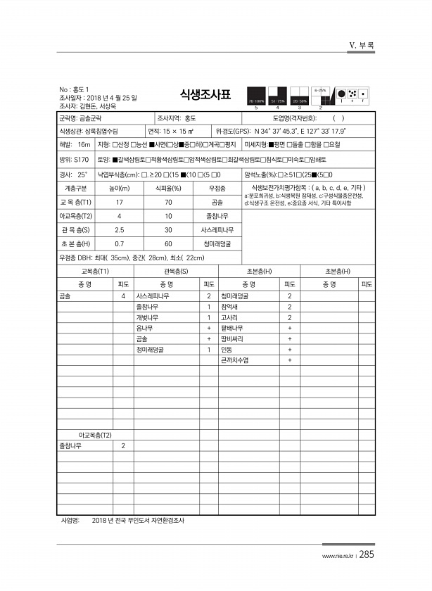 V. 부 록 www.nie.re.kr ?285 No 홍도 1 조사일자 2018 년 4 월 25 일 조사자김현돈, 서상욱 식생조사표 군락명곰솔군락 조사지역홍도 도엽명 격자번호 식생상관상록침엽수림 면적15 × 15 ㎡ 위?경도 GPS N 34° 3745.3, E 127° 3317.9해발16m 지형□산정 □능선 ■사면 □상■중□하 □계곡□평지 미세지형■평면 □돌출 □함몰 □요철 방위S170 토양■갈색삼림토□적황색삼림토□암적색삼림토□회갈색삼림토□침식토□미숙토□암쇄토 경사25° 낙엽부식층 cm □.≥20 □ 15 ■ 10 □ 5 □0 암석노출 % □≥51□ 25■ 5□0 계층구분 높이 m 식피율 % 우점종 식생보전가치평가항목 a, b, c, d, e, 기타 a분포희귀성, b식생복원 잠재성, c구성식물종온전성, 교 목...