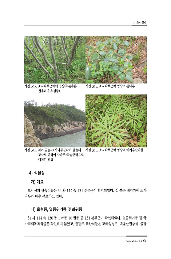 II. 조사결과 www.nie.re.kr ?279 4 호감섬의 관속식물은 54 과 114 속 131 분류군이 확인되었다. 섬 북쪽 해안가에 소사 나무가 다수 분포하고 있다. , 54 과 114 속 120 종 1 아종 10 변종 등 131 분류군이 확인되었다. 멸종위기종 및 국 가적색목록식물은 확인되지 않았고, 한반도 특산식물은 고려엉겅퀴, 백운산원추리, 좀땅 사진 347. 소사나무군락의 임상 초본층은 원추리가 우점종 사진 348. 소사나무군락 임상의 돈나무 사진 349. 과거 곰솔-소사나무군락이 곰솔의 고사로 인하여 사나무-곰솔군락으로 대체된 전경 사진 350. 소사나무군락 임상의애기우산나물