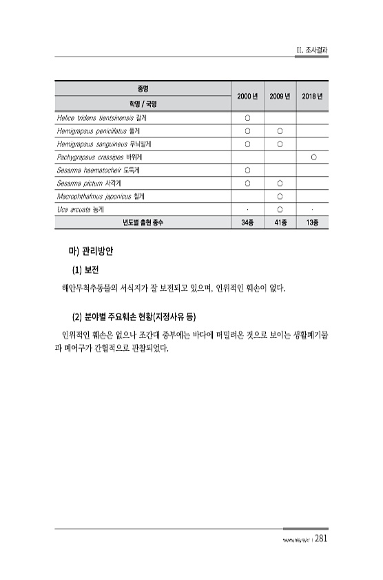 II. 조사결과 www.nie.re.kr ?281 1 해안무척추동물의 서식지가 잘 보전되고 있으며, 인위적인 훼손이 없다. 2 인위적인 훼손은 없으나 조간대 중부에는 바다에 떠밀려온 것으로 보이는 생활폐기물 과 폐어구가 간헐적으로 관찰되었다. 종명 2000 년 2009 년 2018 년 학명 국명 Helice tridens tientsinensis 갈게 ○ Hemigrapsus penicillatus 풀게 ○ ○ Hemigrapsus sanguineus 무늬발게 ○ ○ Pachygrapsus crassipes 바위게 ○ Sesarma haematocheir 도둑게 ○ Sesarma pictum 사각게 ○ ○ Macrophthalmus japonicus 칠게 ○ Uca arcuata 농게 ○ 년도별 출현...