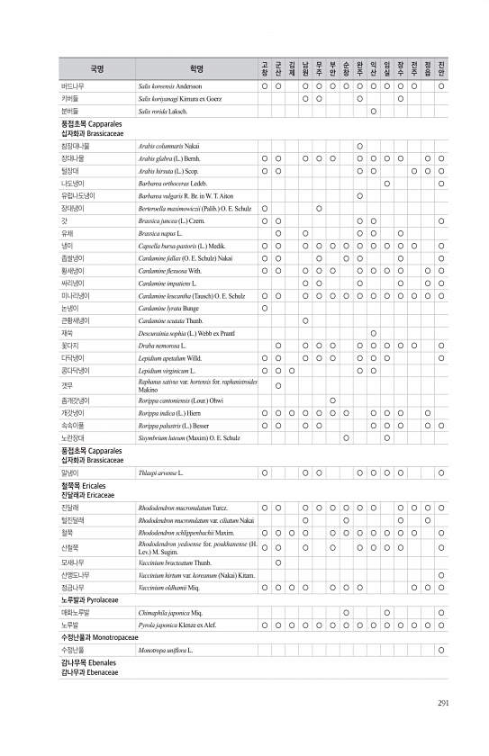 291 버드나무 Salix koreensis Andersson ○ ○ ○ ○ ○ ○ ○ ○ ○ ○ ○ ○ 키버들 Salix koriyanagi Kimura ex Goerz ○ ○ ○ ○ 분버들 Salix rorida Laksch. ○ 풍접초목 Capparales 십자화과 Brassicaceae 참장대나물 Arabis columnaris Nakai ○ 장대나물 Arabis glabra L. Bernh. ○ ○ ○ ○ ○ ○ ○ ○ ○ ○ ○ 털장대 Arabis hirsuta L. Scop. ○ ○ ○ ○ ○ ○ ○ 나도냉이 Barbarea orthoceras Ledeb. ○ ○ 유럽나도냉이 Barbarea vulgaris R. Br. in W. T. Aiton ○ 장대냉이 Berteroella maximowi...