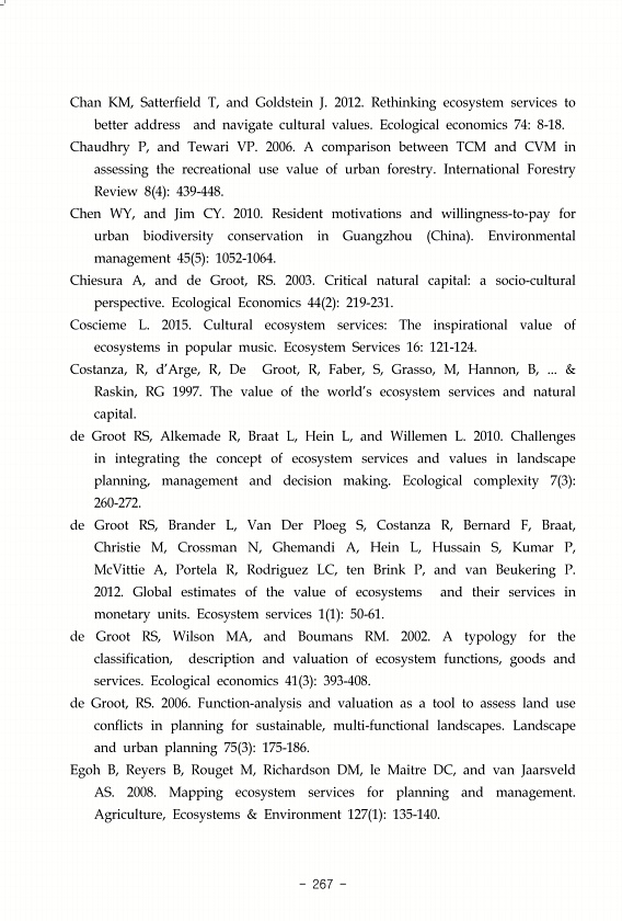 267 Chan KM, Satterfield T, and Goldstein J. 2012. Rethinking ecosystem services to better address and navigate cultural values. Ecological economics 748-18. Chaudhry P, and Tewari VP. 2006. A comparison between TCM and CVM in assessing the recreational use value of urban forestry. International Forestry Review 8 4 439-448. Chen WY, and Jim CY. 2010. Resident motivations and willingness-to-pay for...