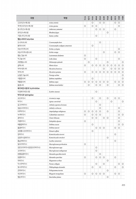 293 긴꼬리산누에나방 Actias artemis ○ ○ ○ ○ ○ 옥색긴꼬리산누에나방 Actias gnoma ○ ○ ○ ○ 참나무산누에나방 Antheraea yamamai ○ ○ ○ ○ 유리산누에나방 Rhodinia fugax ○ 가중나무고치나방 Samia cynthia ○ 뱀눈나비과 Satyridae 도시처녀나비 Coenonympha hero ○ 봄처녀나비 Coenonympha oedippus amurensis ○ 외눈이지옥나비 Erebia cyclopius ○ 외눈이지옥사촌나비 Erebia wanga ○ ○ ○ 뱀눈그늘나비 Lasiommata deidamia ○ 먹그늘나비 Lethe diana ○ ○ ○ 조흰뱀눈나비 Melanargia epimede ○ ○ ○ 굴뚝나비 Minois dryas ○ ○ ○...