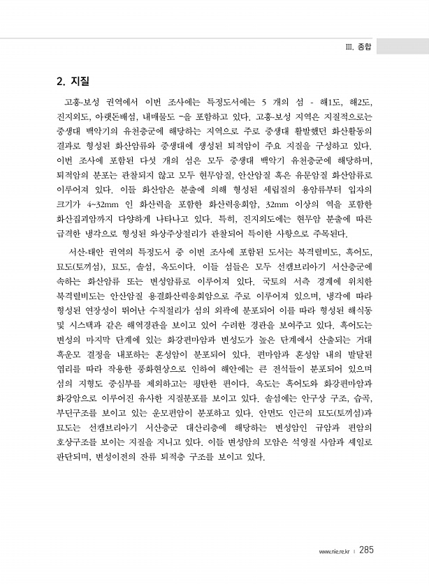 Ⅲ. 종합 www.nie.re.kr ? 285 2. 지질 고흥-보성 권역에서 이번 조사에는 특정도서에는 5 개의 섬 해1도, 해2도, 진지외도, 아랫돈배섬, 내매물도 ?을 포함하고 있다. 고흥-보성 지역은 지질적으로는 중생대 백악기의 유천층군에 해당하는 지역으로 주로 중생대 활발했던 화산활동의 결과로 형성된 화산암류와 중생대에 생성된 퇴적암이 주요 지질을 구성하고 있다. 이번 조사에 포함된 다섯 개의 섬은 모두 중생대 백악기 유천층군에 해당하며, 퇴적암의 분포는 관찰되지 않고 모두 현무암질, 안산암질 혹은 유문암질 화산암류로 이루어져 있다. 이들 화산암은 분출에 의해 형성된 세립질의 용암류부터 입자의 크기가 432mm 인 화산력을 포함한 화산력응회암, 32mm 이상의 역을 포함한 화산집괴암까지 다양하게 나타...