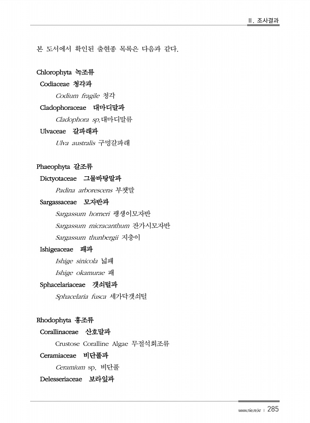 Ⅱ. 조사결과 www.nie.re.kr ? 285 본 도서에서 확인된 출현종 목록은 다음과 같다. Chlorophyta 녹조류 Codiaceae 청각과 Codium fragile 청각 Cladophoraceae 대마디말과 Cladophora sp.대마디말류 Ulvaceae 갈파래과 Ulva australis 구멍갈파래 Phaeophyta 갈조류 Dictyotaceae 그물바탕말과 Padina arborescens 부챗말 Sargassaceae 모자반과 Sargassum horneri 괭생이모자반 Sargassum micracanthum 잔가시모자반 Sargassum thunbergii 지충이 Ishigeaceae 패과 Ishige sinicola 넓패 Ishige okamurae 패 Sphacelariace...