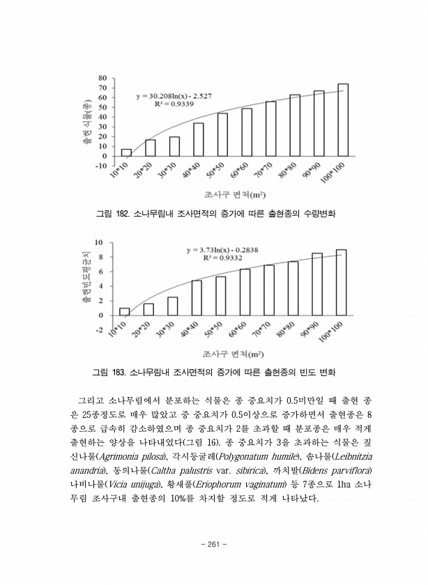 그림 182. 소나무림내 조사면적의 증가에 따른 출현종의 수량변화 그림 183. 소나무림내 조사면적의 증가에 따른 출현종의 빈도 변화 그리고 소나무림에서 분포하는 식물은 종 중요치가 0.5미만일 때 출현 종 은 25종정도로 매우 많았고 중 중요치가 0.5이상으로 증가하면서 출현종은 8 종으로 급속히 감소하였으며 종 중요치가 2를 초과할 때 분포종은 매우 적게 출현하는 양상을 나타내었다 그림 16 종 중요치가 3을 초과하는 식물은 짚 신나물 Agrimonia pilosa , 각시둥굴레 Polygonatum humile , 솜나물 Leibnitzia anandria , 동의나물 Caltha palustris var. sibirica , 까치발 Bidens parviflora 나비나물 Vicia unijuga ,...