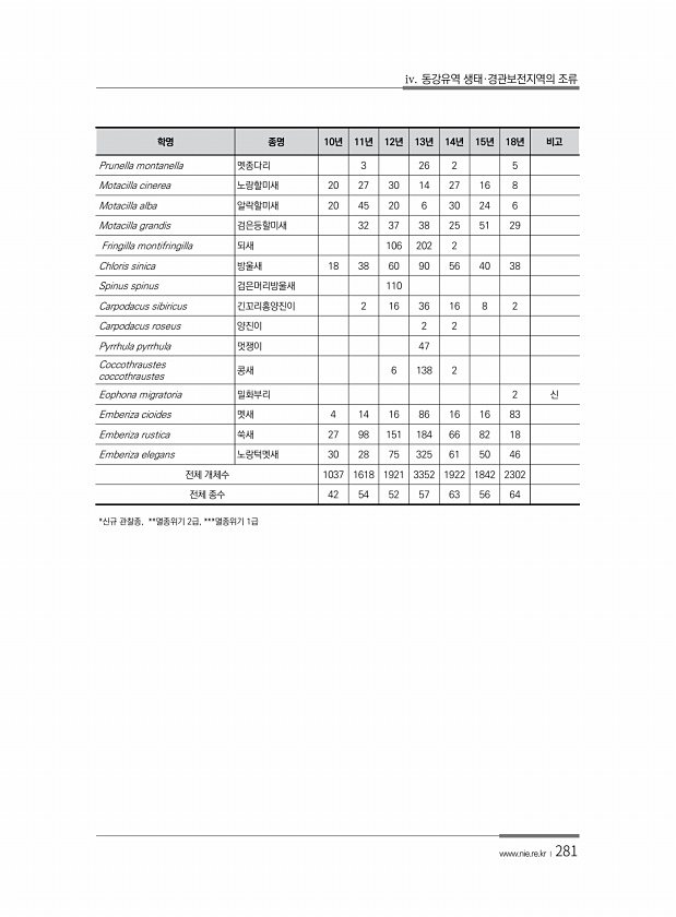 iv. 동강유역 생태·경관보전지역의 조류 www.nie.re.kr ?281 *신규 관찰종, **멸종위기 2급, ***멸종위기 1급 학명 종명 10년 11년 12년 13년 14년 15년 18년 비고 Prunella montanella 멧종다리 3 26 2 5 Motacilla cinerea 노랑할미새 20 27 30 14 27 16 8 Motacilla alba 알락할미새 20 45 20 6 30 24 6 Motacilla grandis 검은등할미새 32 37 38 25 51 29 Fringilla montifringilla 되새 106 202 2 Chloris sinica 방울새 18 38 60 90 56 40 38 Spinus spinus 검은머리방울새 110 Carpodacus sibiricus 긴꼬리홍...