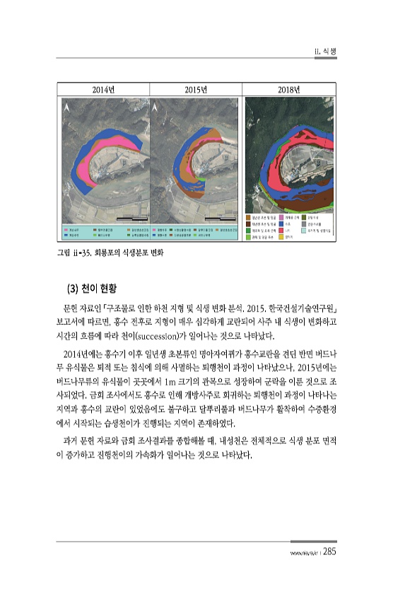 ii. 식 생 www.nie.re.kr ?285 2014년 2015년 2018년 그림 ⅱ-35. 회룡포의 식생분포 변화 3 문헌 자료인 「구조물로 인한 하천 지형 및 식생 변화 분석. 2015. 한국건설기술연구원」 보고서에 따르면, 홍수 전후로 지형이 매우 심각하게 교란되어 사주 내 식생이 변화하고 시간의 흐름에 따라 천이 succession 가 일어나는 것으로 나타났다. 2014년에는 홍수기 이후 일년생 초본류인 명아자여뀌가 홍수교란을 견딘 반면 버드나 무 유식물은 퇴적 또는 침식에 의해 사멸하는 퇴행천이 과정이 나타났으나, 2015년에는 버드나무류의 유식물이 곳곳에서 1m 크기의 관목으로 성장하여 군락을 이룬 것으로 조 사되었다. 금회 조사에서도 홍수로 인해 개방사주로 회귀하는 퇴행천이 과정이 나타나는 ...