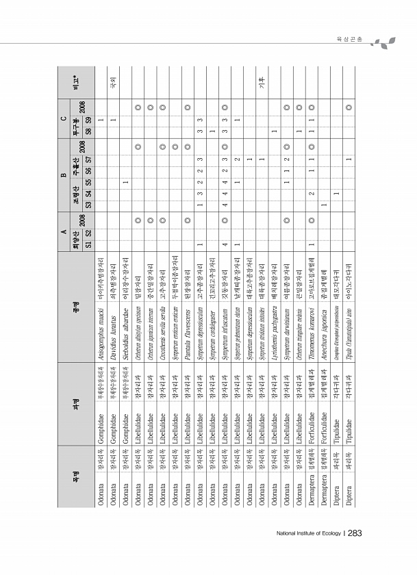 육 상 곤 충 National Institute of EcologyⅠ283 목명 과명 종명 A B C 희양산 비고* 2008 조령산 주흘산 2008 투구봉 2008 S1 S2 S3 S4 S5 S6 S7 S8 S9 Odonata 잠자리목 Gomphidae 부채장수잠자리과 Anisogomphus maacki 마이키측범잠자리 1 Odonata 잠자리목 Gomphidae 부채장수잠자리과 Davidius Iunatus 쇠측범잠자리 1 국외 Odonata 잠자리목 Gomphidae 부채장수잠자리과 Sieboldius albardae 어리장수잠자리 1 Odonata 잠자리목 Libellulidae 잠자리과 Orthetrum albistylum speciosum 밀잠자리 ◎ ◎ ◎ Odonata 잠자리목 Libelluli...