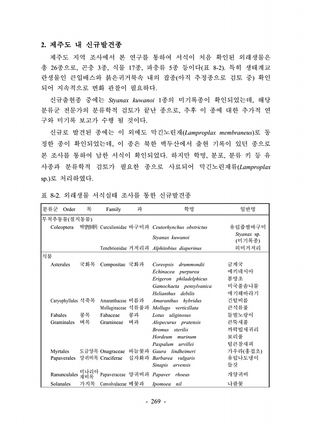 269 분류군 Order 목 Family 과 학명 일반명 무척추동물 절지동물 Coleoptera 딱정벌레목 Curculionidae 바구미과 Ceutorhynchus obstrictus 유럽좁쌀바구미 Styanax kuwanoi Styanax sp. 미기록종 Tenebrionidae 거저리과 Alphitobius diaperinus 외미거저리 식물 Asterales 국화목 Compositae 국화과 Coreopsis drummondii 금계국 Echinacea purpurea 에키네시아 Erigeron philadelphicus 봄망초 Gamochaeta pensylvanica 미국풀솜나물 Helianthus debilis 애기해바라기 Caryophyllales 석죽목 Amaranthaceae 비름과 Ama...