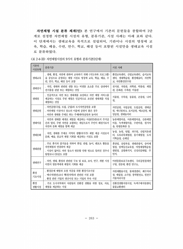 263 자연체험 시설 분류 체계 안 본 연구에서 기존의 문헌들을 종합하여 1단 계로 설정한 자연체험 시설의 유형, 분류기준, 시설 사례는 아래 표와 같다. 이 단계에서는 생태교육을 목적으로 설립되어, 기관이나 시설의 명칭에 교 육, 학습, 배움, 수련, 연수, 학교, 해설 등이 포함된 시설만을 생태교육 시설 로 분류하였다. 기존의 시설유형 분류기준 시설 사례 생태교육 생태, 환경, 자연에 관하여 교육하기 위해 지도자와 프로그램 을 중심으로 운영되는 체험 시설로 명칭에 교육, 학습, 배움, 수 련, 연수, 학교, 해설 등이 포함 환경교육센터, 산림교육센터, 습지교육 센터, 생태학습원, 환경배움터, 자연학 교, 자연환경연수원 생태전시 자연, 생태와 관련된 생물 또는 비생물 요소를 주로 실내에서 전시물을 관람 또...