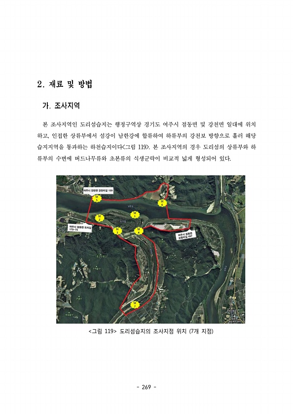 269 본 조사지역인 도리섬습지는 행정구역상 경기도 여주시 점동면 및 강천면 일대에 위치 하고 인접한 상류부에서 섬강이 남한강에 합류하여 하류부의 강천보 방향으로 흘러 해당 , 습지지역을 통과하는 하천습지이다 그림 본 조사지역의 경우 도리섬의 상류부와 하 119 류부의 수변에 버드나무류와 초본류의 식생군락이 비교적 넓게 형성되어 있다. 그림 119 도리섬습지의 조사지점 위치 개 지점 7