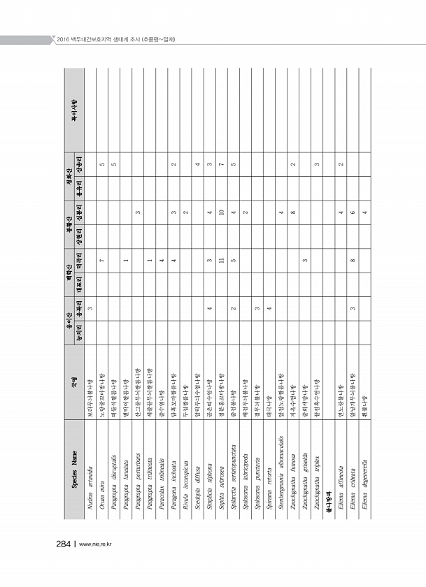 2016 백두대간보호지역 생태계 조사 추풍령밀재 284Ⅰwww.nie.re.kr Species Name 국명 웅이산 백학산 봉황산 청화산 특이사항 능치리 웅북리 대포리 덕곡리 상현리 심봉리 용유리 삼송리 Nudina artaxidia 보라무늬불나방 3 Oruza mira 노랑줄꼬마밤나방 7 5 Pangrapta disruptalis 떠들석짤름나방 5 Pangrapta lunulata 별박이짤름나방 1 Pangrapta perturbans 산그물무늬짤름나방 3 Pangrapta trilineata 세줄끝무늬짤름나방 1 Paracolax trilinealis 줄수염나방 4 Paragona inchoata 담흑꼬마짤름나방 4 3 2 Rivula inconspicua 두점짤름나방 2 Scedopla diffusa ...