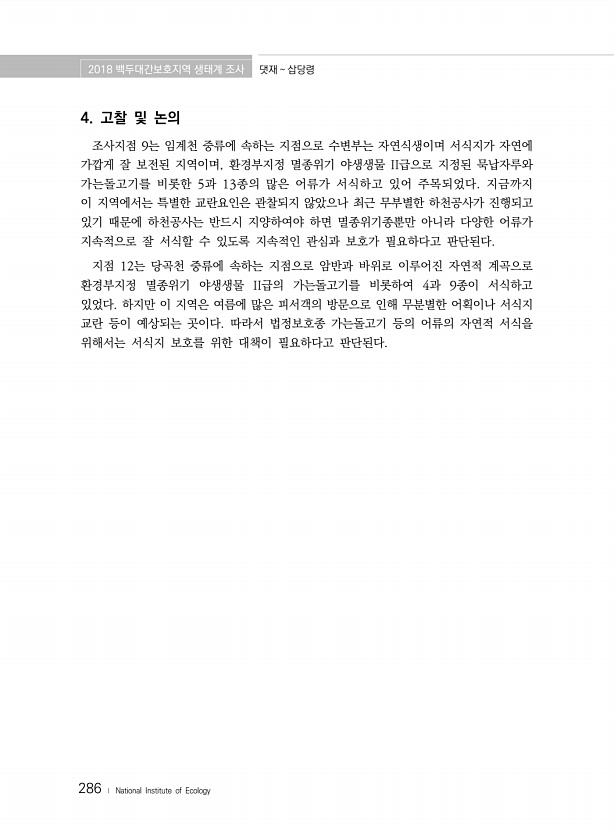 2018 백두대간보호지역 생태계 조사 댓재 삽당령 286 ? National Institute of Ecology 4. 고찰 및 논의 조사지점 9는 임계천 중류에 속하는 지점으로 수변부는 자연식생이며 서식지가 자연에 가깝게 잘 보전된 지역이며, 환경부지정 멸종위기 야생생물 II급으로 지정된 묵납자루와 가는돌고기를 비롯한 5과 13종의 많은 어류가 서식하고 있어 주목되었다. 지금까지 이 지역에서는 특별한 교란요인은 관찰되지 않았으나 최근 무부별한 하천공사가 진행되고 있기 때문에 하천공사는 반드시 지양하여야 하면 멸종위기종뿐만 아니라 다양한 어류가 지속적으로 잘 서식할 수 있도록 지속적인 관심과 보호가 필요하다고 판단된다. 지점 12는 당곡천 중류에 속하는 지점으로 암반과 바위로 이루어진 자연적 계곡으로 환경부...