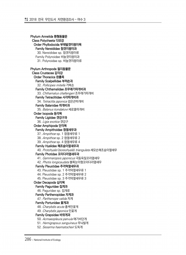 2018 전국 무인도서 자연환경조사 여수 3 286 ? National Institute of Ecology Phylum Annelida 환형동물문 Class Polychaeta 다모강 Order Phyllodocida 부채발갯지렁이목 Family Nereididae 참갯지렁이과 30. Nereididae sp. 참갯지렁이류 Family Polynoidae 비늘갯지렁이과 31. Polynoidae sp. 비늘갯지렁이류 Phylum Arthropoda 절지동물문 Class Crustacea 갑각강 Order Thoracica 완흉목 Family Scalpellidae 부처손과 32. Pollicipes mitella 거북손 Family Chthamalidae 조무래기따개비과 33. Chthamalus chal...