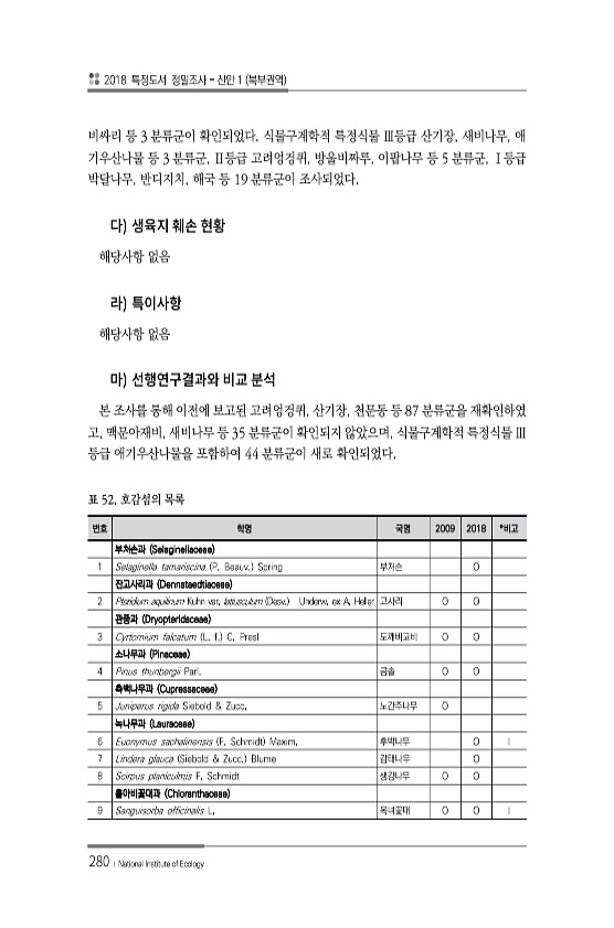 2018 특정도서 정밀조사 신안 1 북부권역 280 ? National Institute of Ecology 비싸리 등 3 분류군이 확인되었다. 식물구계학적 특정식물 Ⅲ등급 산기장, 새비나무, 애 기우산나물 등 3 분류군, Ⅱ등급 고려엉겅퀴, 방울비짜루, 이팝나무 등 5 분류군, Ⅰ등급 박달나무, 반디지치, 해국 등 19 분류군이 조사되었다. 해당사항 없음 해당사항 없음 본 조사를 통해 이전에 보고된 고려엉겅퀴, 산기장, 천문동 등 87 분류군을 재확인하였 고, 맥문아재비, 새비나무 등 35 분류군이 확인되지 않았으며, 식물구계학적 특정식물 Ⅲ 등급 애기우산나물을 포함하여 44 분류군이 새로 확인되었다. 번호 학명 국명 2009 2018 *비고 부처손과 Selaginellaceae 1 Selaginella ...