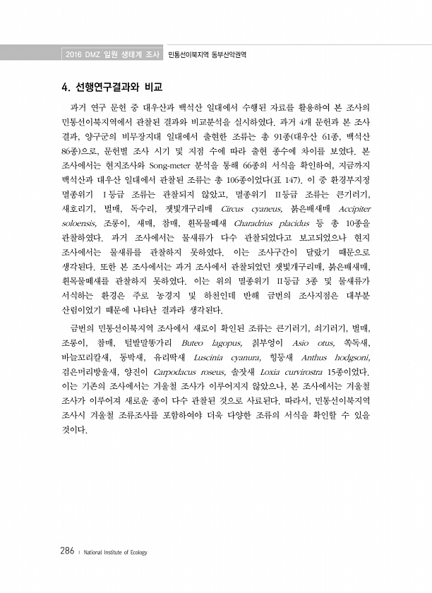 2016 DMZ 일원 생태계 조사 민통선이북지역 동부산악권역 286 ? National Institute of Ecology 4. 선행연구결과와 비교 과거 연구 문헌 중 대우산과 백석산 일대에서 수행된 자료를 활용하여 본 조사의 민통선이북지역에서 관찰된 결과와 비교분석을 실시하였다. 과거 4개 문헌과 본 조사 결과, 양구군의 비무장지대 일대에서 출현한 조류는 총 91종 대우산 61종, 백석산 86종 으로, 문헌별 조사 시기 및 지점 수에 따라 출현 종수에 차이를 보였다. 본 조사에서는 현지조사와 Song-meter 분석을 통해 66종의 서식을 확인하여, 지금까지 백석산과 대우산 일대에서 관찰된 조류는 총 106종이었다 표 147 이 중 환경부지정 멸종위기 Ⅰ등급 조류는 관찰되지 않았고, 멸종위기 Ⅱ등급 조류...