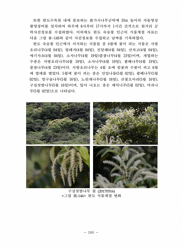 260 또한 완도수목원 내에 분포하는 붉가시나무군락에 35m 높이의 자동영상 촬영장비를 설치하여 하루에 8시부터 17시까지 1시간 간격으로 원거리 군 락사진정보를 수집하였다. 이외에도 완도 숙승봉 인근의 식물계절 자료는 다음 그림 Ⅲ-146와 같이 사진정보를 수집하고 날짜를 기록하였다. 완도 숙승봉 인근에서 서식하는 식물들 중 4월에 꽃이 피는 식물은 사방 오리나무 4월 04일 , 얼레지 4월 04일 , 진달래 4월 04일 , 산자고 4월 04일 , 애기사초 4월 04일 , 소사나무 4월 19일 졸참나무 4월 23일 이며, 개엽하는 수종은 사방오리나무 4월 19일 , 소사나무 4월 19일 , 팥배나무 4월 19일 , 졸참나무 4월 23일 이다. 사방오리나무는 4월 초에 암꽃과 수꽃이 피고 6월 에 열매를 맺...
