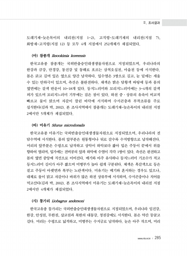 Ⅱ. 조사결과 www.nie.re.kr ? 285 도래기재늦은목이의 내리천 지점 12 , 고직령도래기재의 내리천 지점 7 , 화방재고직령 지점 12 등 모두 4개 지점에서 252개체가 채집되었다. 마 참종개 Iksookimia koreensis 한국고유종 참종개는 국외반출승인대생생물자원으로 지정되었으며, 우리나라의 한강과 금강, 만경강, 동진강 및 동해로 흐르는 삼척오십천, 마읍천 등에 서식한다. 몸은 굵고 길며 잎은 옆으로 양간 납작하다. 입수염은 3쌍으로 길고, 눈 밑에는 세울 수 있는 안하극이 있으며, 측선은 불완전하다. 채색은 밝은 담황색 바탕에 등과 몸의 옆면에는 갈색 반문이 1018개 있다. 등지느러미와 꼬리지느러미에는 34개의 갈색 띄가 있으며 꼬리지느러미 기부에는 검은 점이 있다. 하천 중·상...