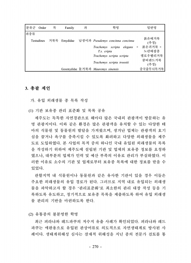 270 분류군 Order 목 Family 과 학명 일반명 파충류 Testudines 거북목 Emydidae 남생이과 Pseudemys concinna concinna 붉은배거북 추정 Trachemys scripta elegans × T.s. cripta 붉은귀거북 × 노란배잡종 Trachemys scripta scripta 옐로우벨리거북 Trachemys scripta troostii 쿰버랜드거북 추정 Geoemydidae 돌거북과 Mauremys sinensis 중국줄무늬목거북 3. 총괄 제언 가. 유입 외래생물 종 목록 작성 1 기관 보유종 관리 표준화 및 목록 공유 제주도는 독특한 자연경관으로 해마다 많은 국내외 관광객이 방문하는 유 명 관광지이다. 이와 같은 환경은 많은 관광객을 유치할 수 있는 다양...