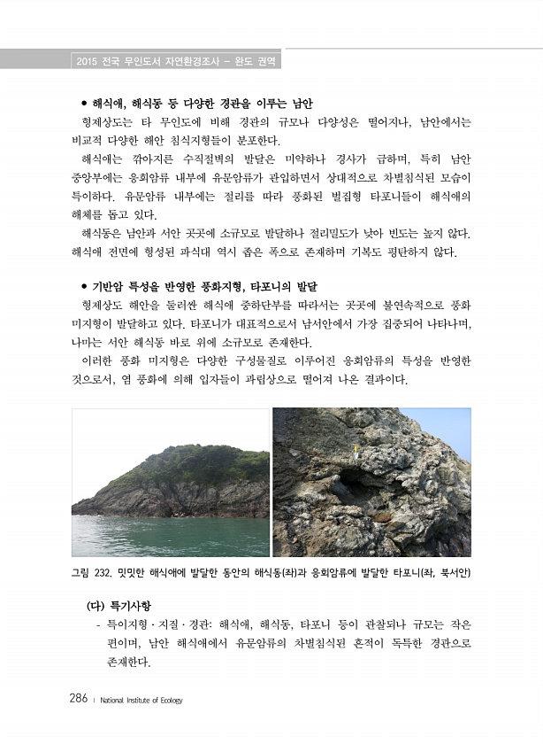 2015 전국 무인도서 자연환경조사 완도 권역 286 ? National Institute of Ecology ? 해식애, 해식동 등 다양한 경관을 이루는 남안 형제상도는 타 무인도에 비해 경관의 규모나 다양성은 떨어지나, 남안에서는 비교적 다양한 해안 침식지형들이 분포한다. 해식애는 깎아지른 수직절벽의 발달은 미약하나 경사가 급하며, 특히 남안 중앙부에는 응회암류 내부에 유문암류가 관입하면서 상대적으로 차별침식된 모습이 특이하다. 유문암류 내부에는 절리를 따라 풍화된 벌집형 타포니들이 해식애의 해체를 돕고 있다. 해식동은 남안과 서안 곳곳에 소규모로 발달하나 절리밀도가 낮아 빈도는 높지 않다. 해식애 전면에 형성된 파식대 역시 좁은 폭으로 존재하며 기복도 평탄하지 않다. ? 기반암 특성을 반영한 풍화지형,...