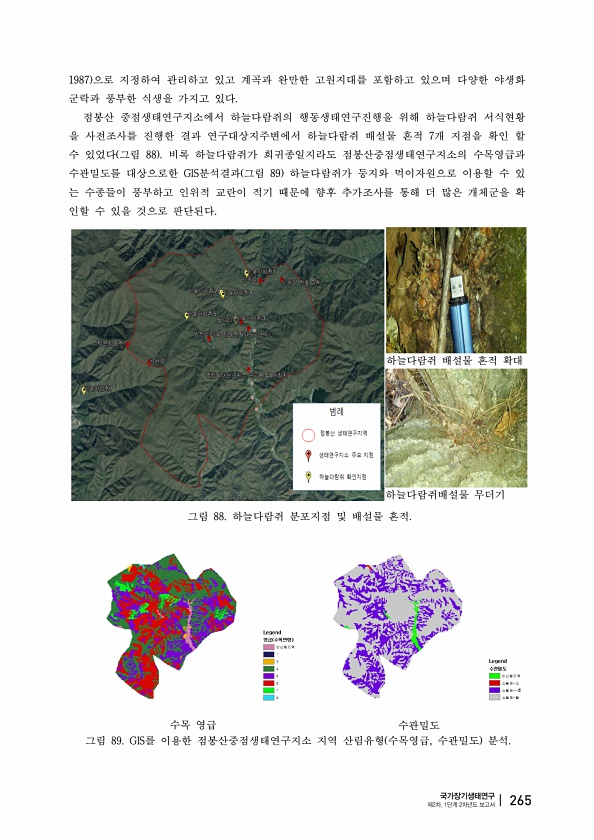 하늘다람쥐 배설물 흔적 확대 하늘다람쥐배설물 무더기 그림 88. 하늘다람쥐 분포지점 및 배설물 흔적. 1987 으로 지정하여 관리하고 있고 계곡과 완만한 고원지대를 포함하고 있으며 다양한 야생화 군락과 풍부한 식생을 가지고 있다. 점봉산 중점생태연구지소에서 하늘다람쥐의 행동생태연구진행을 위해 하늘다람쥐 서식현황 을 사전조사를 진행한 결과 연구대상지주변에서 하늘다람쥐 배설물 흔적 7개 지점을 확인 할 수 있었다 그림 88 비록 하늘다람쥐가 희귀종일지라도 점봉산중점생태연구지소의 수목영급과 수관밀도를 대상으로한 GIS분석결과 그림 89 하늘다람쥐가 둥지와 먹이자원으로 이용할 수 있 는 수종들이 풍부하고 인위적 교란이 적기 때문에 향후 추가조사를 통해 더 많은 개체군을 확 인할 수 있을 것으로 판단된다. 수목 영급...