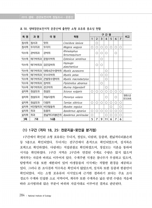 2015 생태·경관보전지역 정밀조사 운문산 284 ? National Institute of Ecology 표 50. 생태경관보전지역 운문산에 출현한 소형 포유류 종조성 현황 목 명 과 명 국 명 학명 구 간 명 비고 1 2 3 4 5 6 7 첨서목 첨서과 땃쥐 Crocidura lasiura ○ 첨서목 두더지과 두더지 Mogera wogura ○ ○ ○ ○ ○ ○ ○ 익수목 관박쥐과 관박쥐 Rhinolophus ferrumequinum ○ ○ ○ ○ 익수목 애기박쥐과 문둥이박쥐 Eptesicus serotinus ○ 익수목 애기박쥐과 검은집박쥐 Hypsugo alaschanicus ○ ○ 익수목 애기박쥐과 대륙쇠큰수염박쥐 Myotis aurascens ○ 익수목 애기박쥐과 우수리박쥐 Myotis petax...