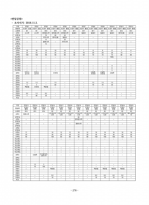 반달공원 조사시기2018.11.2. 구분 반달1 반달2 반달3 반달4 반달5 반달6 반달7 반달8 반달9 반달10 반달11 반달12 중분류 조경수 침엽 조경수 침엽 조경수 활엽 조경수 활엽 조경수 활엽 조경수 활엽 조경수 활엽 조경수 활엽 조경수 활엽 조경수 활엽 조경수 활엽 조경수 활엽 소분류 B1 B1 B10 B10 B10 B11 B11 B11 B11 B11 B12 B13 교목1 소나무 소나무 양버즘나무 양버즘나무 양버즘나무 칠엽수 칠엽수 칠엽수 칠엽수 칠엽수 중국단풍 산수유 교목1% 70 90 50 교목2 자작나무 중국단풍 칠엽수 교목2% 15 30 교목3 왕벚나무 자작나무 교목3% 15 교목4 교목4% 교목H 10 10 12 10 10 7 7 8 8 8 7 4 교목D 25 25 25 25 25 16 ...
