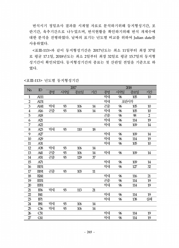 265 번식시기 정밀조사 결과를 시계열 자료로 분석하기위해 둥지형성기간, 포 란기간, 육추기간으로 나누었으며, 번식현황을 확인하기위해 번식 개체수에 대한 분석을 진행하였다. 날짜의 표기는 년도별 비교를 위하여 Julian date를 사용하였다. 표Ⅲ-113 과 같이 둥지형성기간은 2017년도는 최소 11일부터 최장 37일 로 평균 17.1일, 2018년도는 최소 2일부터 최장 32일로 평균 15.7일의 둥지형 성기간이 확인되었다. 둥지형성기간의 종료는 첫 산란일 전일을 기준으로 하 였다. No. ID 2017 2018 종명 시작일 종료일 기간 종명 시작일 종료일 기간 1 A111 박새 96 105 10 2 A131 박새 포란시작 3 A141 박새 93 106 14 곤줄 96 105 10 4 A16 곤줄 93...