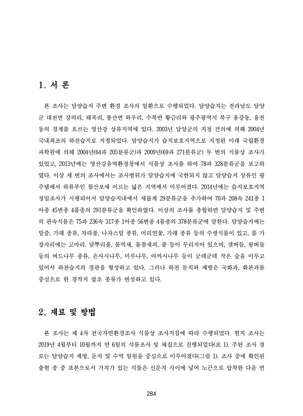 284 1. 서 론 본 조사는 담양습지 주변 환경 조사의 일환으로 수행되었다. 담양습지는 전라남도 담양 군 대전면 강의리, 태목리, 봉산면 와우리, 수북면 황금리와 광주광역시 북구 용강동, 용전 동의 경계를 흐르는 영산강 상류지역에 있다. 2003년 담양군의 지정 건의에 의해 2004년 국내최조의 하천습지로 지정되었다. 담양습지가 습지보호지역으로 지정된 이래 국립환경 과학원에 의해 2004년 64과 205분류군 과 2009년 69과 271분류군 두 번의 식물상 조사가 있었고, 2013년에는 영산강유역환경청에서 식물상 조사를 하여 78과 328분류군을 보고하 였다. 이상 세 번의 조사에서는 조사범위가 담양습지에 국한되지 않고 담양습지 상류인 광 주댐에서 하류부인 월산보에 이르는 넓은 지역에서 이루어졌다. 20...